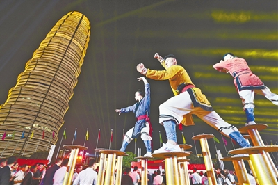 如意湖畔“中”字门前,具有少林功夫风格的舞狮舞龙表演《祥龙瑞狮迎远客》表达着郑州人的热情好客;步入“郑州之夜”沉浸式体验区,以黄河“几字弯”为创意的区域设计显得极为巧妙,沿途集纳了少林寺、嵩阳书院、中岳庙、立雪亭、炎黄二帝塑像、观星台、嵩岳寺塔等极具代表性的郑州文化地标;每个“地标”前都有独特的节目等待开启,可能是童子功、梅花桩等少林功夫,又或许是负黍聚银饰锻制技艺、耿氏香制作技艺等非遗文化展示,与会嘉宾“沿着黄河”缓慢移步,动静之间,体验到郑州特色文旅的无穷魅力……