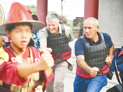 6日,参加2023中国(郑州)国际旅游城市市长论坛的嘉宾到开封参观考察。图为嘉宾在开封古城墙上向“宋兵”学习武术。
