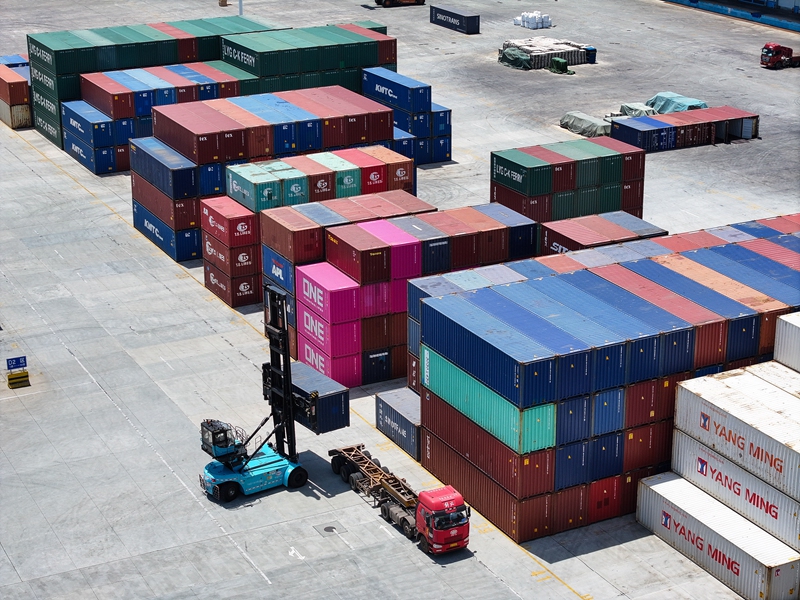 2024年6月26日,在上合组织(连云港)国际物流园内的中国外运集装箱场站,集装箱搬运机在堆放集装箱(无人机照片)。
