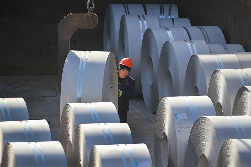2023年2月14日,在上合组织(连云港)国际物流园内的江苏海州港务股份有限公司内河码头,工人在向船舶上装运不锈钢卷。