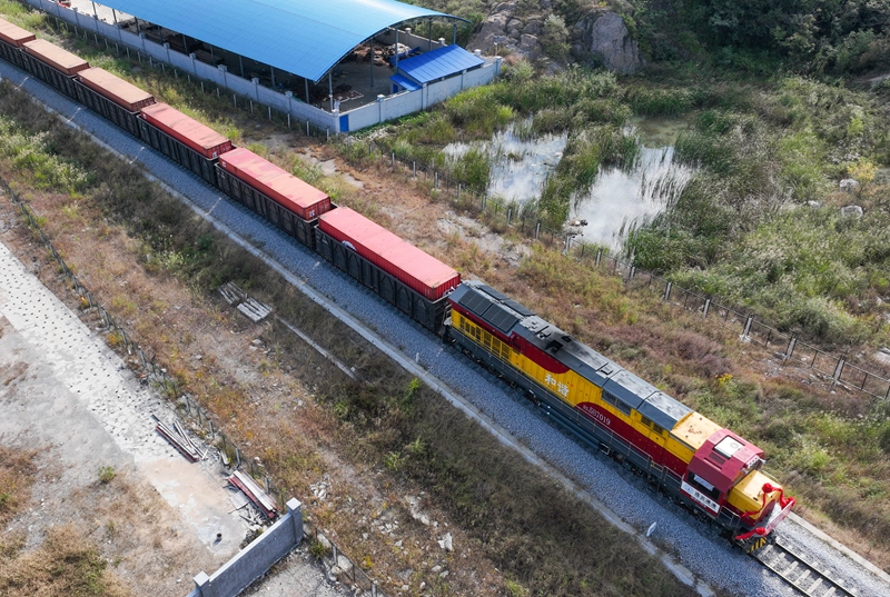 2022年10月13日,江苏首列中吉乌“公铁联运”国际货运班列从上合组织(连云港)国际物流园铁路场站发车(无人机照片)。
