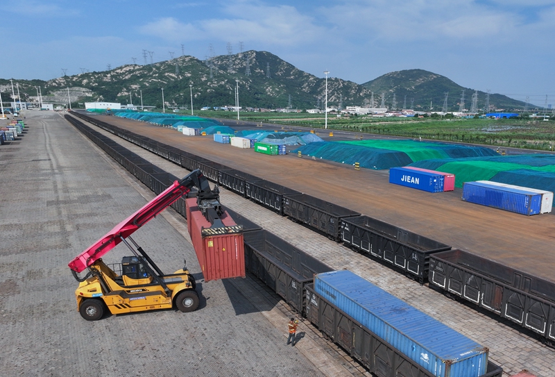 2023年8月16日,在上合组织(连云港)国际物流园铁路装卸场站,大型机械向火车车厢里吊装集装箱(无人机照片)。