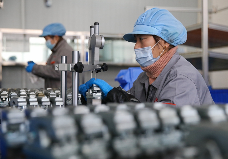 2023年2月14日,在上合组织(连云港)国际物流园内的钛铭高端液压元件企业车间,工人正在生产工程机械核心液压元器件。