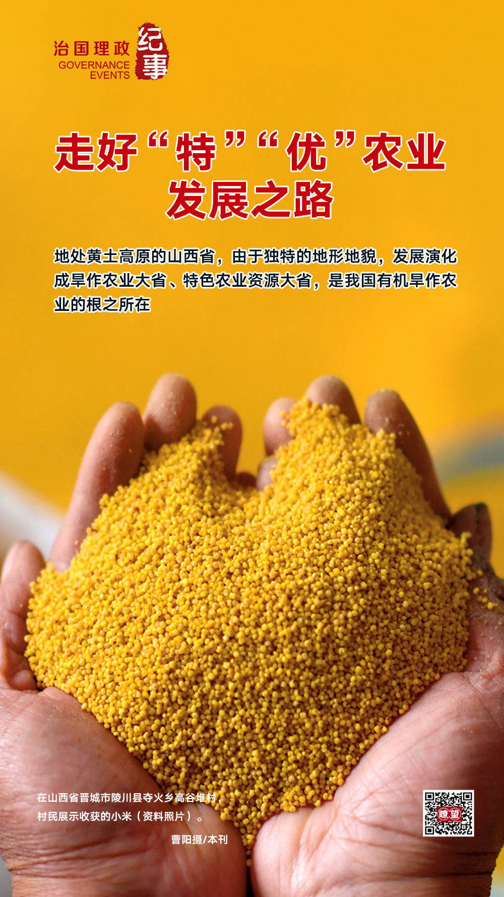 山西多项有机旱作经验和技术持续推动农民增收农业增效,并在全国领先,成为现代农业高质量发展的“山西样板”。截至目前,山西累计培育了山西小米等12个省级区域公用品牌、运城苹果等46个市级区域公用品牌,拥有绿色、有机认证有效产品2058个,地理标志农产品数量位列全国第四,杂粮种质资源近4万份,居全国首位。