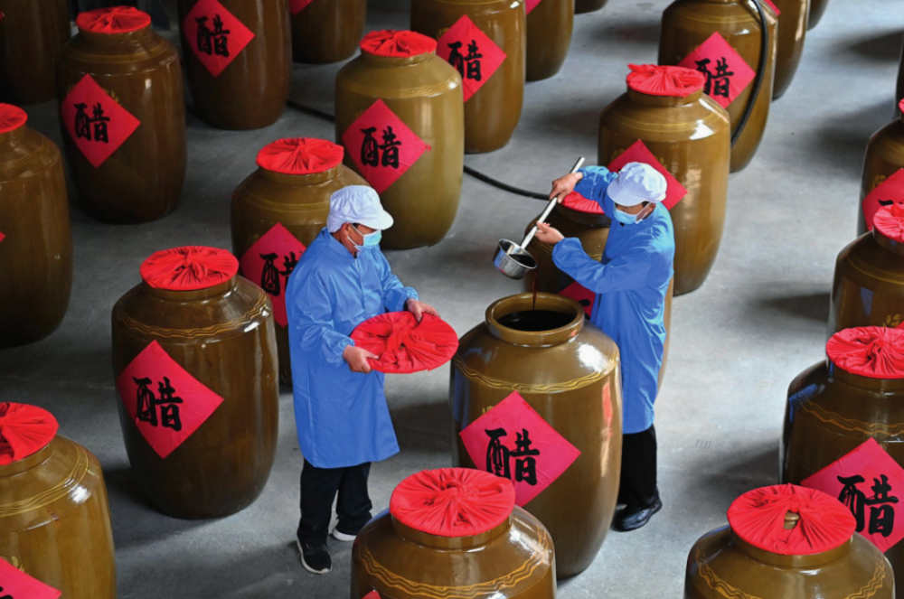 工作人员在山西省长治市平顺县龙溪镇龙镇村农旅产业融合发展示范园内查看醋的成色(2024 年 5 月 10 日摄) 杨晨光摄 / 本刊